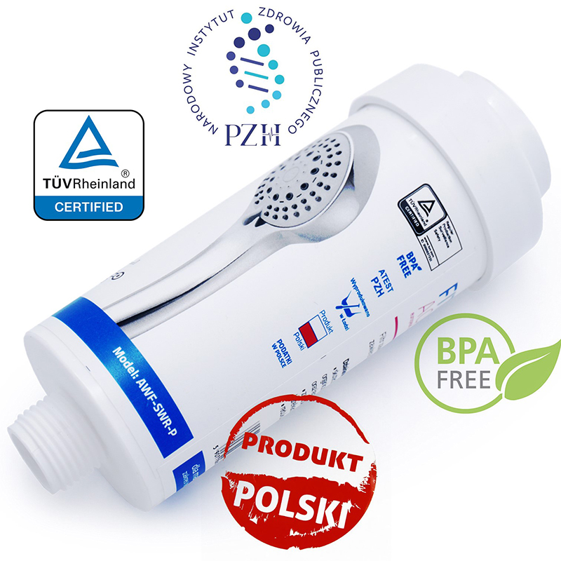 AWF-SWR-P - nowoczesny filtr prysznicowy zawiera złoże cyknowo-miedziowe, które zatrzymuje metale ciężkie. Złoże zawiera tez polifosfat, neutralizujące działanie wysuszających soli wapnia i magnezu.