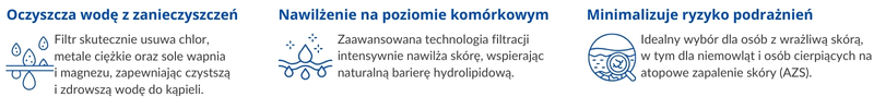 Skutecznie usuwa chlor, metale ciężkie i sole wapnia z wody, jednocześnie nawilżając skórę na poziomie komórkowym oraz wzmacniając włosy, co zapewnia zdrową i bezpieczną kąpiel dla całej rodziny.