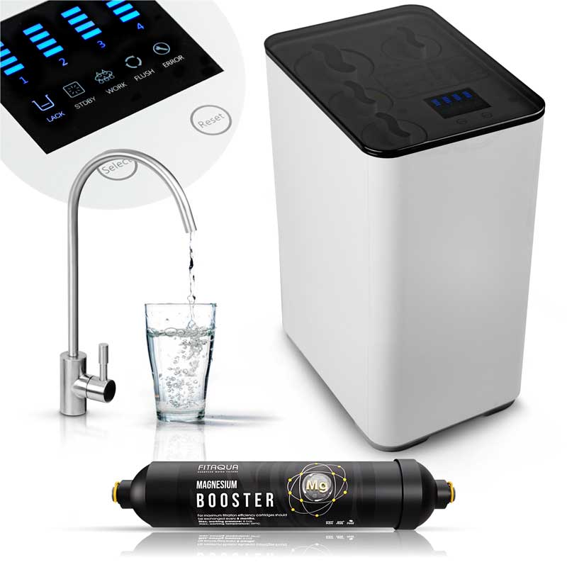 Nowoczesny, bezzbiornikowy system odwróconej osmozy RO600. Zestaw z mineralizatorem MAGNESIUM BOOSTER.
