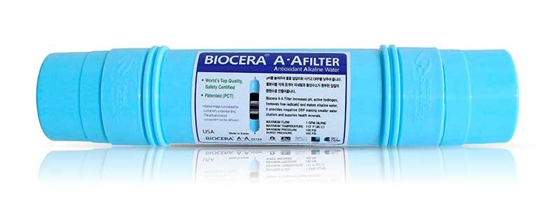 Wydajny, bazujący na minerałach wkład antyoksydacyjny, renomowanego koreańskiego producenta Biocera. Opatentowana technologia Biocera zawarta w dużym (rozmiar 2,5"x11") wkładzie filtracyjnym. Wkład jonizuje wodę, podnosi pH oraz obniża ORP (potencjał redukcji utleniania) nawet do -750 mV.