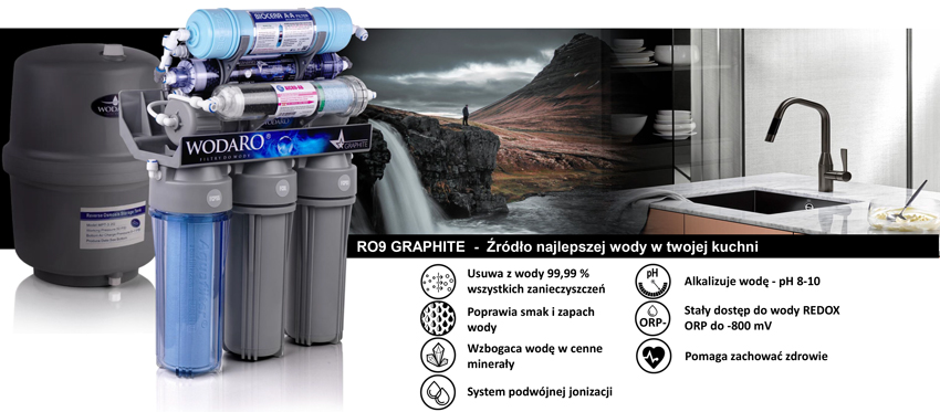 RO9 WodaRO GRAPHITE Jest kompletnym urządzeniem osmotycznym pozwalającym uzyskać wodę pozbawioną takich zanieczyszczeń jak: trujące i rakotwórcze związki chemiczne, metale ciężkie, bakterie i wirusy. Doskonałość systemu polega na zastosowaniu technologii 9 - stopniowego uzdatniania wody, możliwości jej domineralizowania oraz zastosowania systemu podwójnej jonizacji. Urządzenie pozwala na stały dostęp do najlepszej jakości wody alkaicznej REDOX o ujemnym wskaźniku ORP, która posiada niezwykłe właściwości prozdrowotne. Zbudowany z najlepszych komponentów dostępnych na rynku charakteryzuje się długoletnią bezawaryjną pracą.