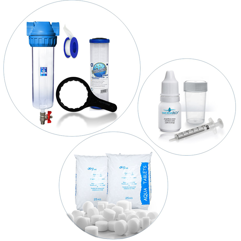 Do zestawu dołączony jest filtr wstępny z zaworem spustowym FHPR-3V_R, z wkładem siatkowym wielokrotnego użytku. W komplecie klucz do obudowy, płytka montażowa oraz taśma teflonowa. Zestaw montowany przed zmiękczaczem w celu poprawy jakości wody a tym samym ochrony złoża znajdującego się w zmiękczaczu. Filtr wyposażony w zawór spustowy, umożliwiający wypłukiwanie osadu z filtra bez konieczności wyjmowania wkładu.
